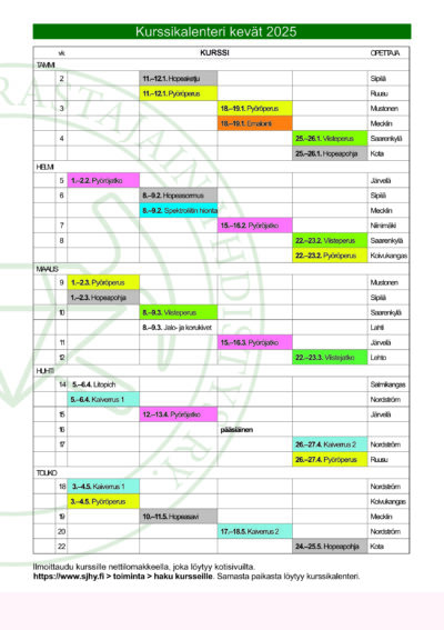 Kurssit kevät 20253.12.2024 in Tiedotteet kirjoittajalta Ismo Hellsten KURSSIKALENTERI KEVÄT 2025 – vain SJHY jäsenille – Ilmoittaudu kurssille nettilomakkeella, joka löytyy kotisivulta: https://www.sjhy.fi/…/yhdistyk…/ilmoittautumiset-kursseille/ Tervetuloa oppimaan uusia taitoja !