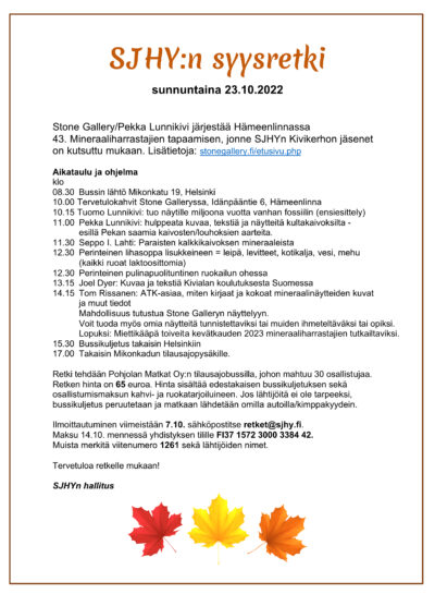 Syysretki 23.10.20228.9.2022 in Tiedotteet kirjoittajalta Ismo Hellsten Retkelle voivat osallistua myös ei jäsenet. Tervetuloa