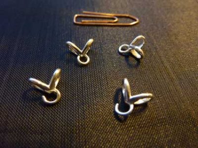 Reunauran käyttö antaa mahdollisuuden mm. kaksipuolueisten korujen vapaaseen muotoiluun, mikäli Sargentan kiinnike tuntuu liian heppoiselta suuremman kivikorun kanssa. Työssä tarvitaan urakiinnike (Kuva 8). Kiinnitys on Kuopiolaisen jäsenemme Juhani Hakalan ideoima. Kuvan kiinnike on tehty lenkiksi kierretystä hopealangasta, jonka päät on juotettu yhteen ja levitetty soikioksi. Soikion päälle juotetaan poikittain puolipyöreä kannake ja omatekoinen kiinnike on valmis.