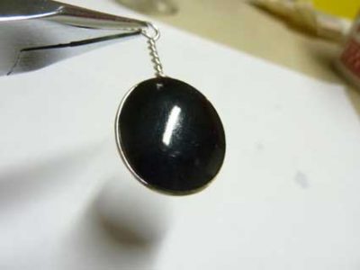 Kiinnike antaa kiven muotoiluun monenlaisia valintavapauksia. Jos päätetään esimerkiksi tehdä kaksipuolinen riipus, porataan reunareikä ennen kuin aletaan muotoilla varsinaista taulupintaa. Porauksen jälkeen voi kiven molemmat puolet hioa miten miellyttää – samanlaisiksi tai erilaisiksi, capochon-muoto, pisara-muoto tai suorapinta. Ajatelkaa esimerkiksi spektroliittia – nyt ei ole mitään hopeareunusta peittämässä kaikkea kiven välkettä. (Kuva 5).