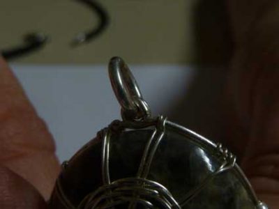 Malli Marja Heilimon omintakeisesta reunakiinnityksestä, jossa reunalanka on kiinnitetty avoimeen hopealenkkiin (esim. 5mm lenkki, Sargenta 2503S). Kiven molemminpuoliset halkaisijana kulkevat kiinnikkeet on molemmista reunoista kierretty reunalankaan ja keskeltä kierretty yhteen. (Kuva 13)