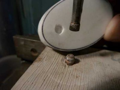 Valmiin ripustuskiinnikkeen käyttö on toinen helppo työtapa. (Kuvassa 3) porataan reikä pohjamuotoillun kiven reunaan käyttäen Dremelin porausistukkaa ja hiomakonetta ja porausterää. Dremelin kaiverruskoneita ja poraustelinettä myyvät rautakaupat ja Clas Ohlsson.