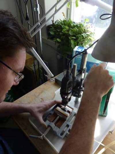 Reiän poraus taulun läpi on yksinkertainen ripustuskiinnityksen tekotapa. Toisaalta reiät voivat myös varsin arvokkaiden kivien kanssa olla pois suljettu vaihtoehto. Jos reikä ei häiritse, niin siitä vaan. Poraus on hyvä tehdä ennen kiven muotoilua kun kivi tasapaksuna on vielä helposti kiinnipidettävissä. Jotta porauksessa terän läpitulo ei samalla lohkaisisi reiän reunoja, on poraus tehtävä kiven molemmilta puolilta.