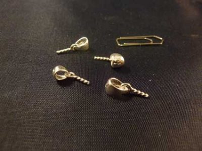Valmiita porausreikään liimattavia kiinnikkeitä on saatavissa esimerkiksi verkkokaupoista. (Kuva 4) Sargenta Ab:n keskikoon malli 7042S (s=silver eli hopea). Kiinnikkeitä on kolmea eri kokoa, tapin pituus noin 4 mm. Ne sopivat hyvin pienehköjen korukivien ripustukseen. Klemmari on antamassa kuvaan mittakaavan.