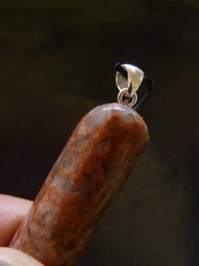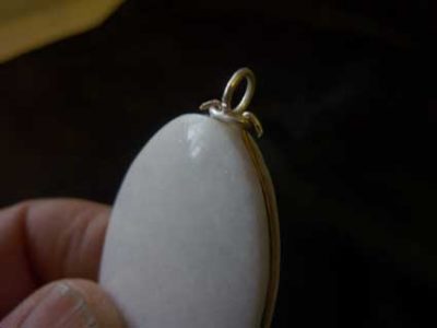 Sopivan muotoiset ja näköiset luonnonkivet kelpaavat toisinaan pelkällä porauksella ja ripustuskiinnikkeellä varustettuina koruksi. (Kuva 7). Liimatessa on kuitenkin tarkkaan katsottava että kiinnikkeen rintamasuunta on sama kuin kivenkin että ei käy niin kuin kuvassa 6.