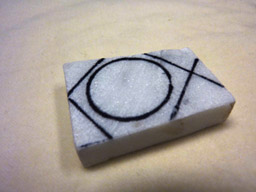Kun ylimääräiset palat on sahattu pois, muotoillaan irtisahattu koruaihio pohjakuvion mukaiseksi. Nyt voi koruaihioon piirtää hiomisen apuviivat. Koruaihion taulupuolelle merkitään tussikynällä keskipiste ja sen kautta piirretään noin 90 asteen kulmassa apuviivat, joita jatkossa käytetään apuna muotoilussa. Suurempien kivien hionnassa voi tarvittaessa vielä lisätä apuviivojen määrää. Tussijäljet imeytyvät jonkin verran marmorin sisään, joten ne vaativat hieman ylimääräistä hiontaa.