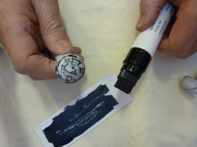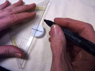 Reunaviivan voi piirtää joko hopeaistutuksen rajausta varten tai hionnan apuviivaksi. Aseta aihio pöydälle ja tussikynä sen viereen. Piirrä reunaviiva pyörittämällä aihiota tussikynän kärkeä vasten. Viivatason nostamiseksi käytä kynän alla apuna vaikkapa pelikortteja. Reunaviivan vuorostaan saa piirrettyä alemmaksi latomalle pelikortteja kiven alle.