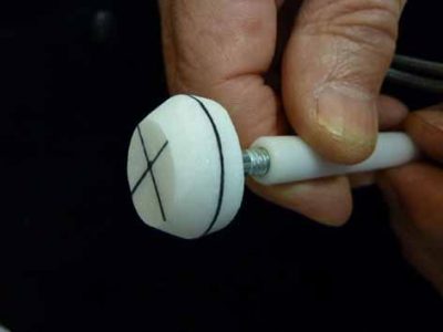 Lopuksi kiinnitetään aihio esim. liimadopsiin. Dopsina voi käyttää SJHY:n jäsenmyynnissä olevaa liimadopsia. Levitä ruuviin vain ohut liimarengas (LocTite SuperGlue Precision). Liika liima ei tartuta ruuvia kiveen. Aseta ruuvi kiveen heti suoraan oikealle paikalleen. Ruuvi on viidessä sekunnissa lujasti kiinni kivessä.