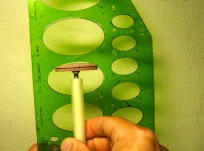 Sen näkeminen kaartuvatko cabochonin molemmat olkapäät samanmuotoisina, on monilla vaikeaa nähdä. Siinä voidaan käyttää apuna ovaalimuodon sapluunaa. Sitä ei kuitenkaan ole pakko sahata halki kuten kikan keksiä Paul Meriluoto – useiden hiontakilpailujen menestyjä – on tehnyt. Tarkistaminen voidaan tehdä myös ehjän sapluunan kanssa. Kuvassa 7 näyttää olevan kaikki hyvin, cabochon nyt sattuu vain olemaan melkein sapluunan muotoinen – aavistuksen litteämpi. Muoto voi kuitenkin olla hyvinkin erilainen ja silti sapluuna auttaa muodon arvioinnissa. Sapluunoita on saatavissa hyvin varustetuissa askarteluliikkeissä.