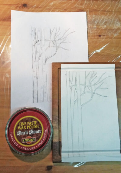 Kuva 1: Paperille piirretty malli on kopioitu valkoiselle kontaktimuoville. Puulevy on käsitelty vahalla, jottei kuvion ulkopuolelle leviävä liima tahraisi reunoja.