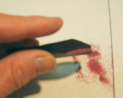 - Levitin levyn pinnalle vahaa (tai sellakkaa), tarkoituksena estää liiman leviäminen kaiverrettujen urien sivuille. Kuvion sivuille levinnyt liimatahra saattaa näkyä vielä hionnan jälkeenkin.