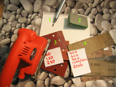 Seuraavat hiontavaiheet 120 ja 240 tein hiontapaperilla ja tasohiomakoneella. Viimeiset hionnat 400-600-800-1000-2000 tein käsin; ne ovat helppoja vaiheita.